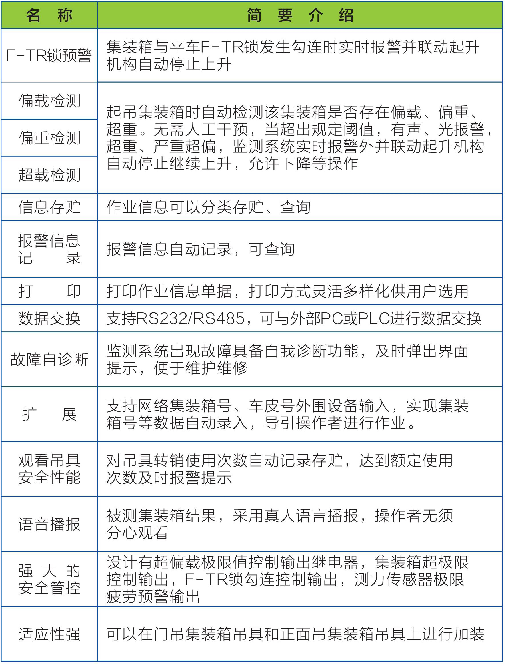 集装箱超偏载(F-TR锁)检测系统从装卸作业源头上去控制集装箱装错车(空重箱混装)/偏截箱及超重集装上车,同时防控卸车作业过程F-TR锁平车与集装箱发生勾连由此产生的安全事故的发生。先进的技术与科技成果的广泛应用,大大的提升了吊机的智能化、自动化,大幅度减少了因人为操作不当而造成的事故发生。